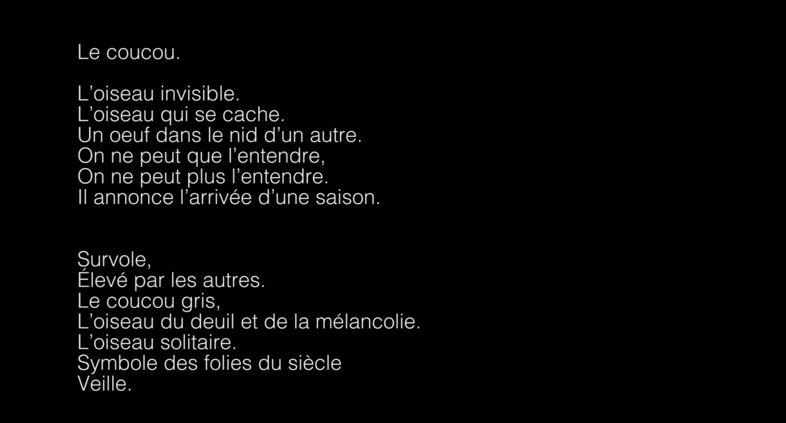Vidéo qui oscille entre trois plans séquences et trois poésies visuelles autour d’un village de la péninsule ibérique et le coucou, qui est à la fois un animal qu’on entend mais qu’on ne voit jamais ainsi que le nom que l’on donne à des maisons primaires de paysans pour se protéger du vent.